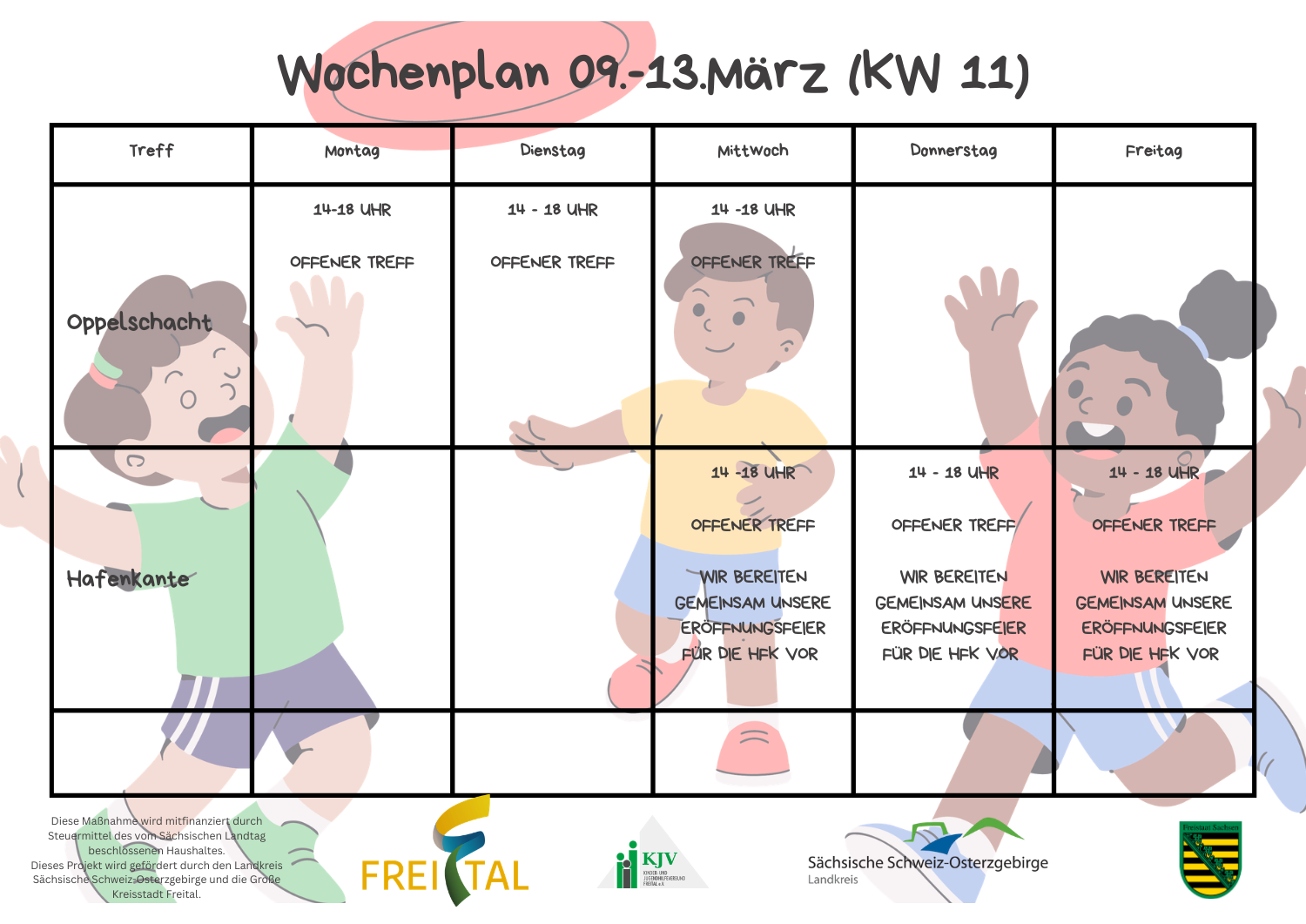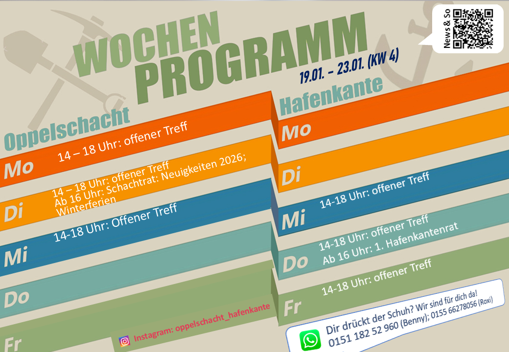 3. Der aktuelle Wochenplan bzw. Änderungen werden auf Aushängen am Eingang (Infokasten) der Treffpunkte ausgehangen und bekannt gegeben!